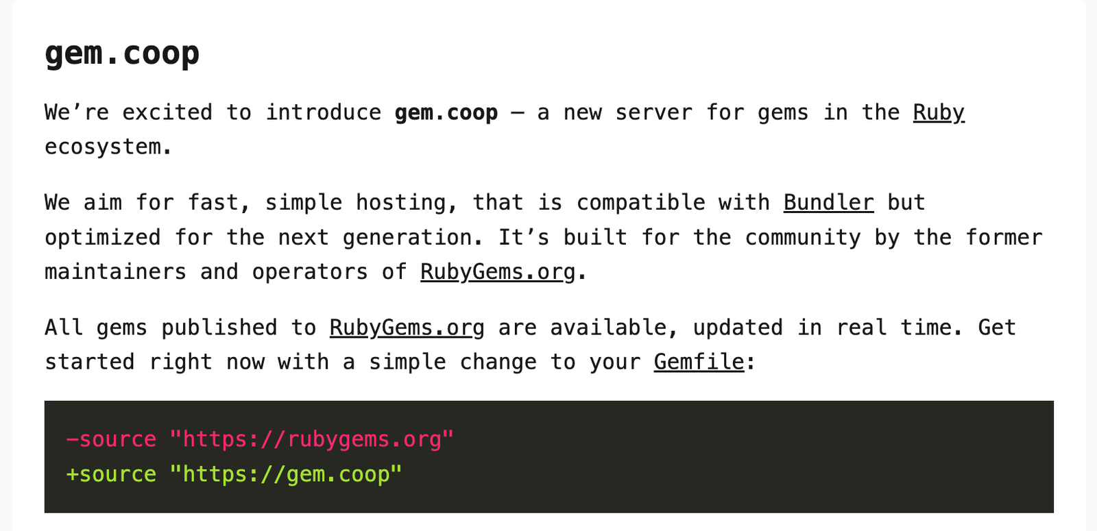 According to project maintainer Martin Emde, gem.coop is already live and fully operational, with edge caching in place to ensure fast, reliable access. All gems published to RubyGems.org are made available on gem.coop in real time.
