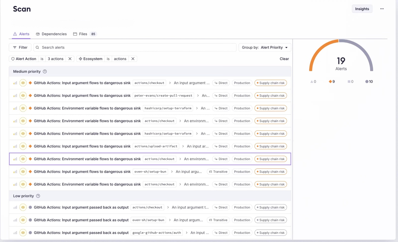 Beyond standard scanning, Socket now surfaces a new class of custom GitHub Actions alerts powered by Argus, an open-source taint-tracking engine, developed by North Carolina State University and Purdue University for detecting unsafe data flows. Socket uses Argus to analyze how data moves through Actions, identifying cases where untrusted inputs, workflow context, or parameters reach sensitive sinks such as environment variables, shell commands, or outputs.