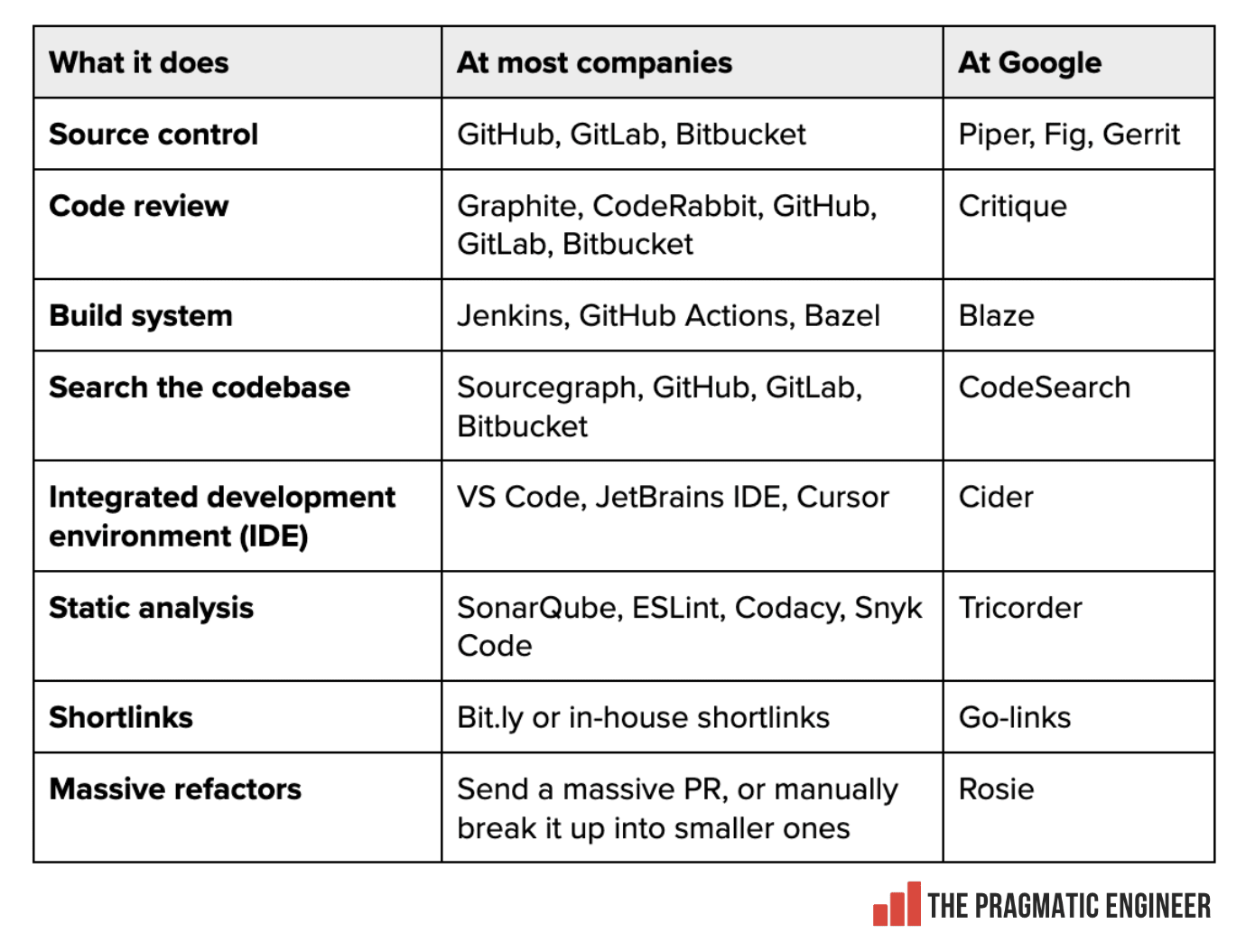 Google’s infrastructure is distinct from every other tech company because it’s all completely custom: not just the infra, but also the dev tools. Google is a tech island, and engineers joining the tech giant can forget about tools they’re used to – GitHub, VS Code, Kubernetes, etc. Instead, it’s necessary to use Google’s own version of the tool when there’s an equivalent one.