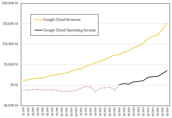 Google Cloud, the infrastructure rental arm of the company, posted $15.16 billion in sales, rising 33.5 percent compared to the year ago period, and largely because GenAI customers (and particularly large ones like model builders OpenAI and Anthropic) are spending big bucks to get their hands on any GPUs and XPUs they can. (We expect much the same story at Microsoft and Amazon Web Services.) Operating income for Google Cloud rose by a very nice 84.6 percent to $3.59 billion, but still only represented 14.8 percent of Google Cloud’s revenues. The trend for profitability has been improving over the years, particularly as Google has kept server iron on the books longer rather than just writing it off after three years as it used to do. That is not economically feasible anymore, not even for a hyperscaler and particularly not one with its core search engine and related advertising business under direct threat from GenAI.