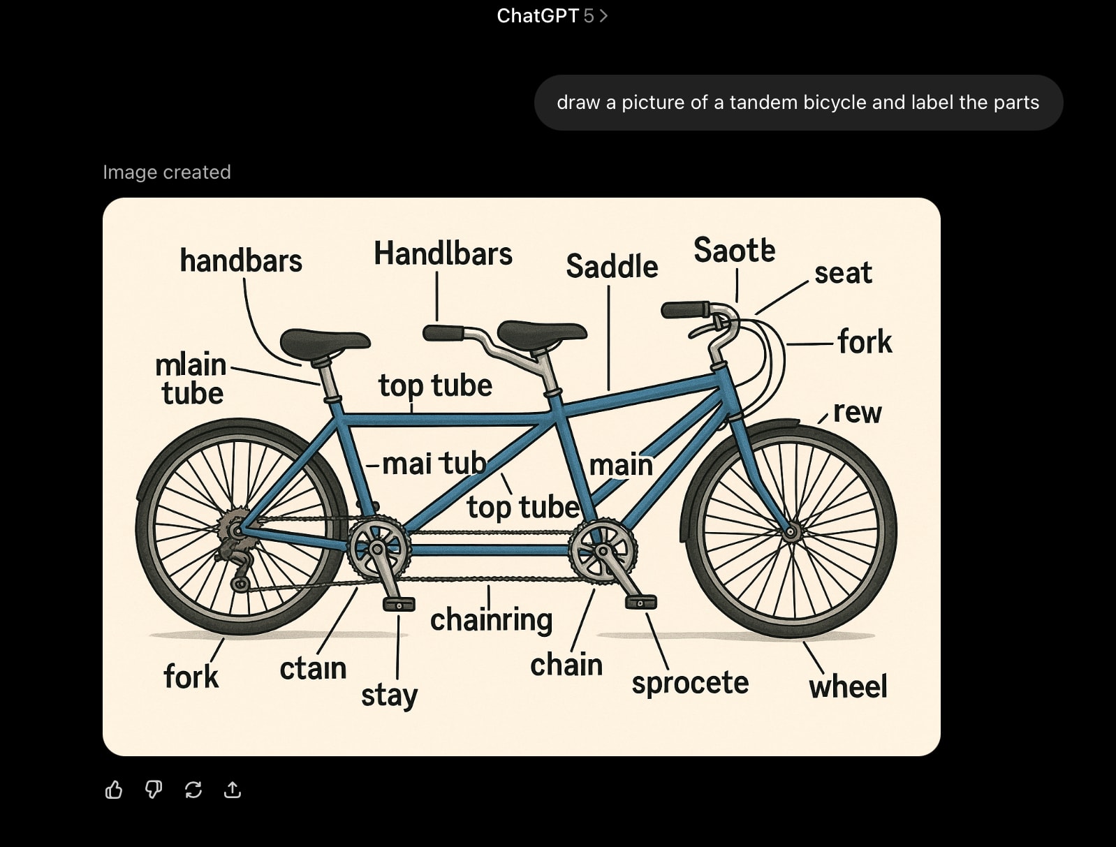 The challenge of parts and wholes in generative images that Ernest Davis and I discussed here in December fared no better. (Some argued that this is because GPT-5 is still using an older models for generating images, but given that the new thing was supposed to be tantamount to AGI and “fully multimodal” that hardly seems like a compelling excuse.)