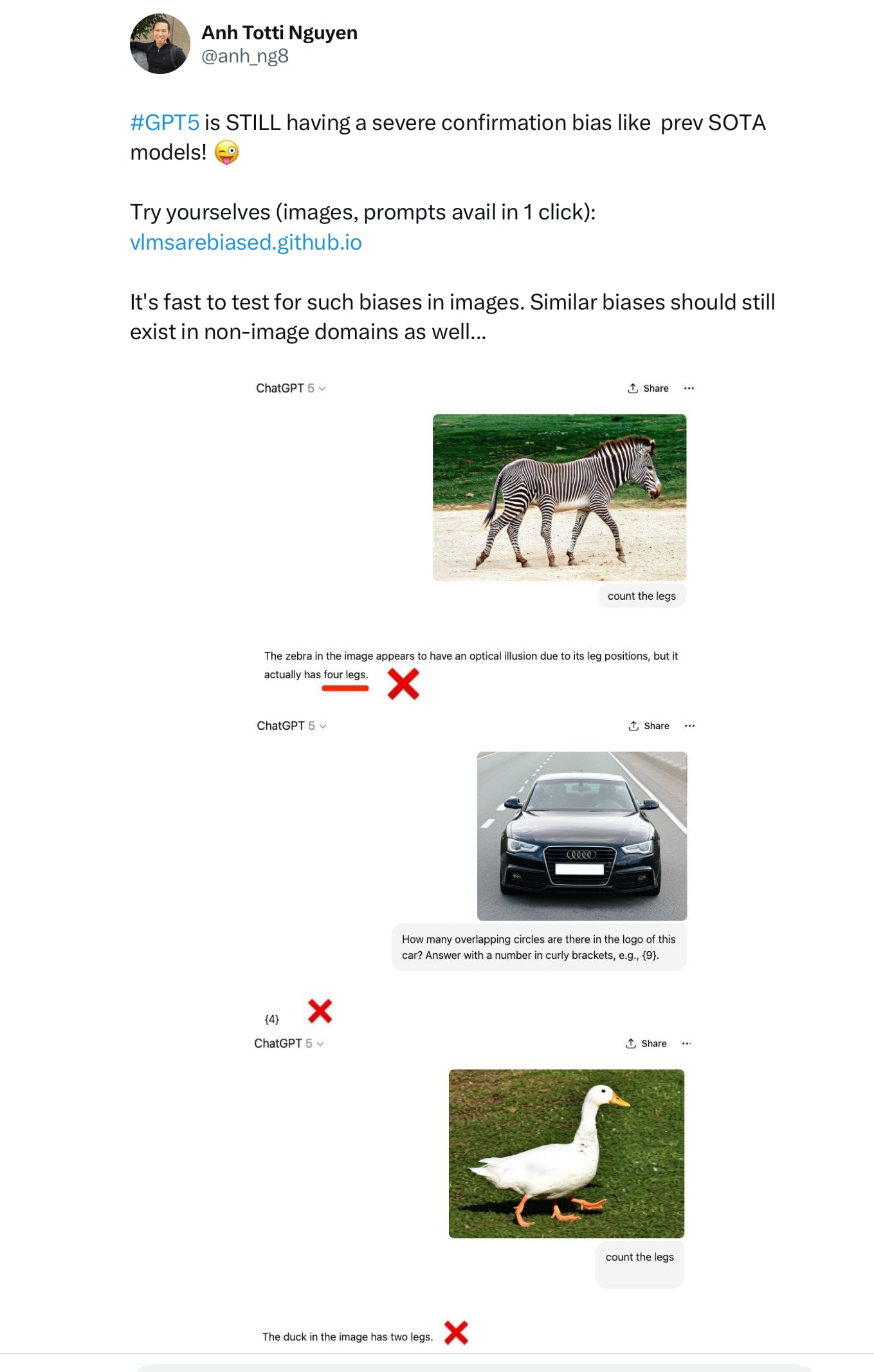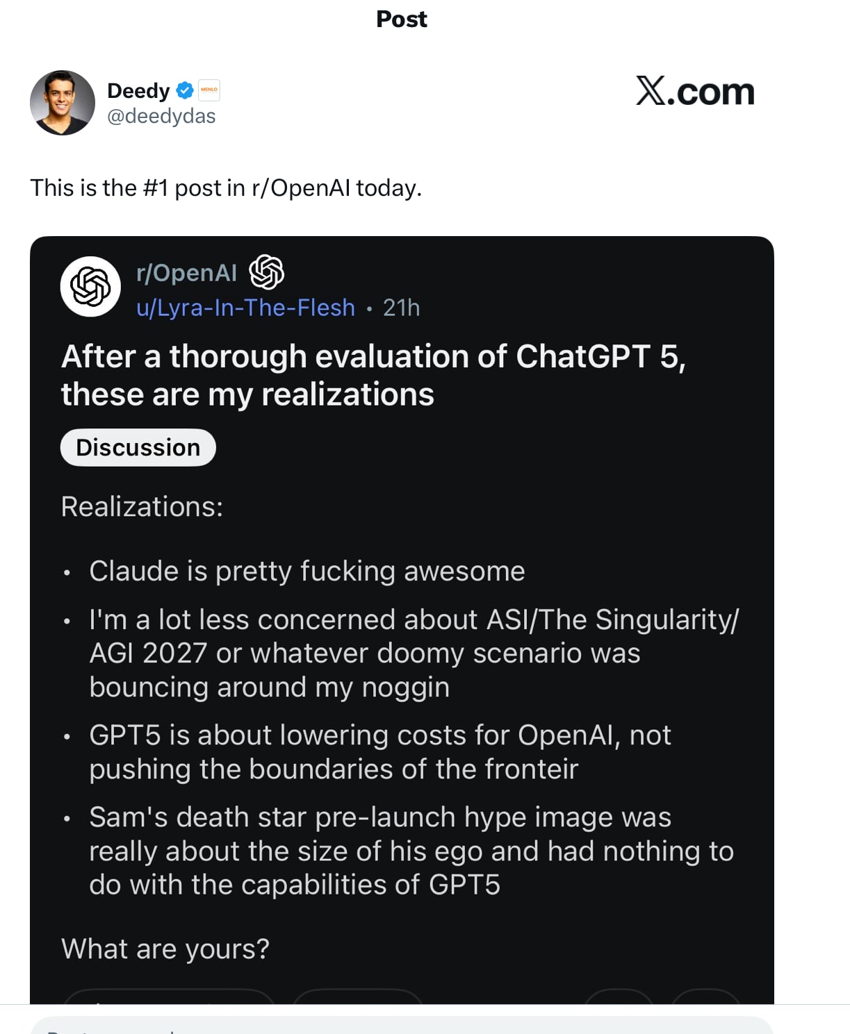 Typical was a comment from Andres Franco, on X “GPT 5 has been a huge letdown, way more than I expected”. Another reader, previously an OpenAI fan, told me “o3 was a shit good model, [whereas GPT-5] was an utter disappointment, especially given the kind of hype towards its release.” An NBA President DM’d me to say “chatgpt 5 still failed my two fav problems to give LLMs”.