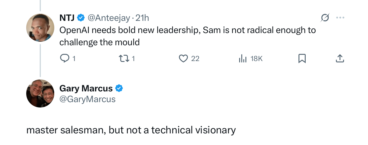 What the mainstream media mostly hasn’t told you yet is that a few days later, hardly anybody is buying Altman’s story.