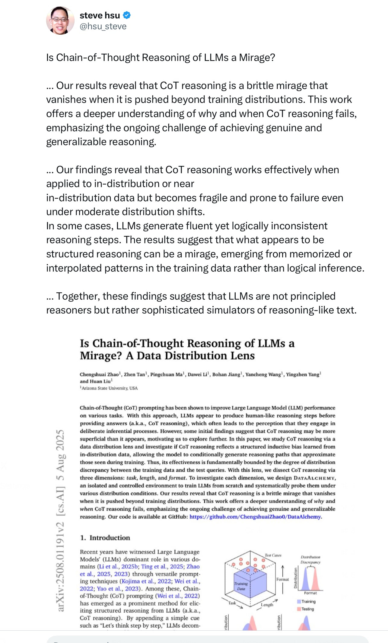 The real news is a breaking study from Arizona State University that fully vindicates what I have told you for nearly 30 years—and more recently what Apple told you—about the core weakness of LLMs: their inability to generalize broadly.