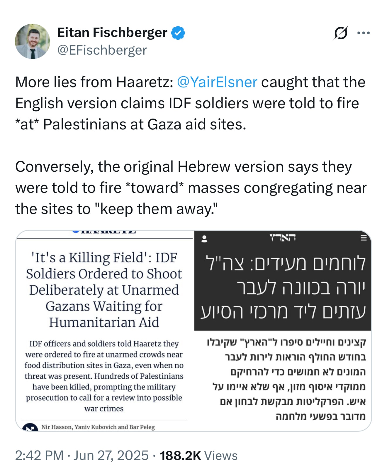 As flagged by @YairElsner and posted on X by the relentlessly excellent Eitan Fischberger, Haaretz’s English edition claims that IDF soldiers were ordered to fire at unarmed Palestinians waiting for food in Gaza, but the original Hebrew version? It states they were told to fire towards crowds to keep them away from the aid sites. This represents a significant difference in intent, legality, and moral implications.