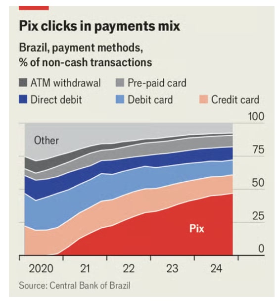 As I understand it, Pix is sort of like a publicly run version of Zelle, the payment system operated by a consortium of U.S. private banks. But Pix is much easier to use. And while Zelle is big, Pix has become simply huge, used by a reported 93 percent of Brazilian adults. It appears to be rapidly displacing both cash and cards: