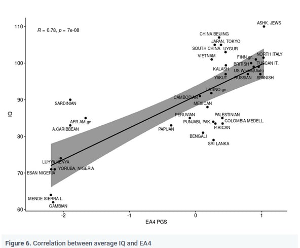 The horizontal axis is EA4, a polygenic score for predicted educational attainment, generally believed to correlate somewhat with IQ. The vertical axis is observed IQ of each group. Piffer’s point is that different ethnic groups’ predicted genetic intelligence seems to correlate pretty well with their observed intelligence, so maybe group differences in intelligence are genetic.