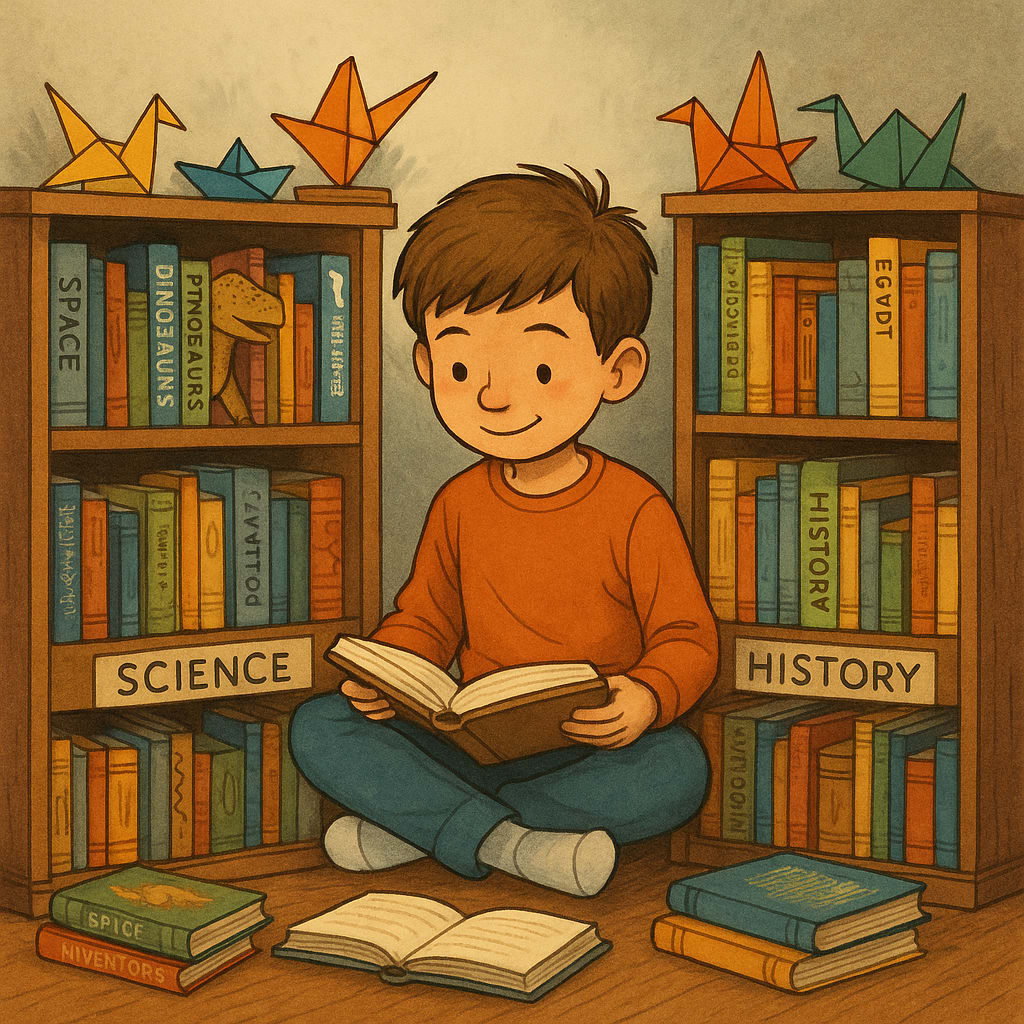 Outside of meals, math & writing practice, and social events, our son can basically do what he wants with his time. Much is spent in storytelling, crafts, and fiction reading. But Helen has also assembled a pretty amazing non-fiction children’s library for our son over the years, which he puts to good use. He’s learned an immense amount from self-directed reading on whatever topics he’s interested in (everything from plant biology to the Haitian revolution). Whenever he asks questions that go beyond our knowledge during mealtime discussions, Helen replies, “Let me buy you a book on that.” He soon knows more about the topic than we do.