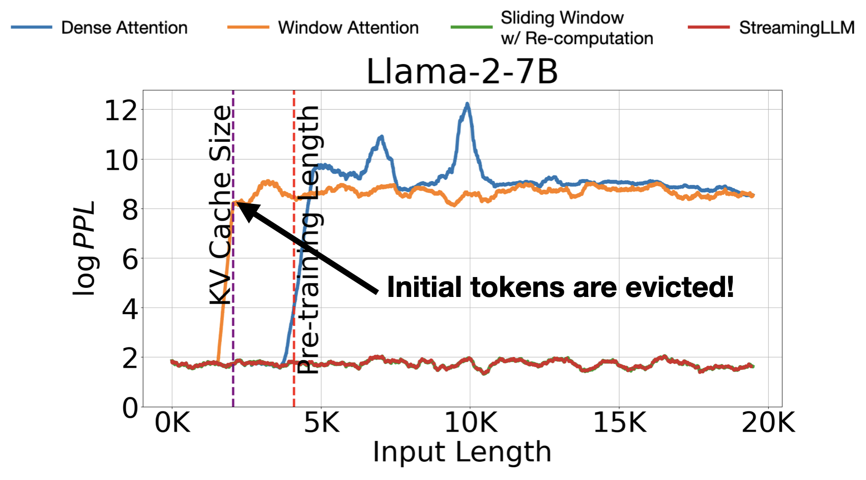The obvious solution seemed to be a sliding window approach: keep a fixed-size cache of the most recent tokens' internal states (their Key and Value vectors, known as the KV cache) and simply drop the oldest ones as the conversation grows. This approach is efficient and—as we discovered—fails spectacularly.