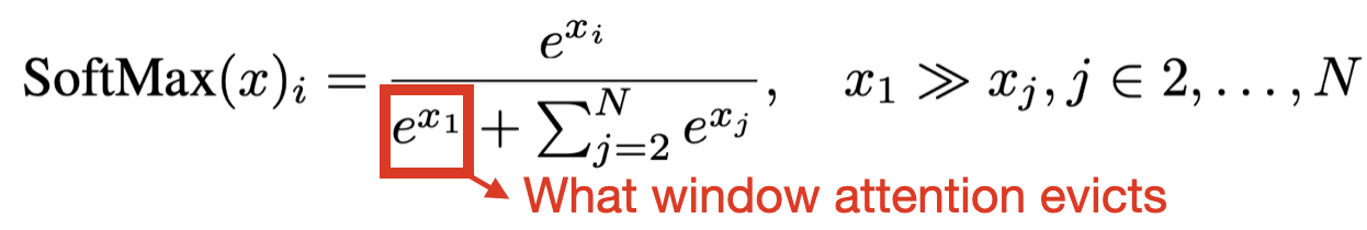 Our discovery suddenly illuminated why the sliding window approach failed so catastrophically. When we evicted those initial tokens, we weren't simply removing old context—we were removing a huge proportion of the denominator in the softmax function, dismantling the model's fundamental mechanism for maintaining attention stability. We had inadvertently removed its pressure valve.