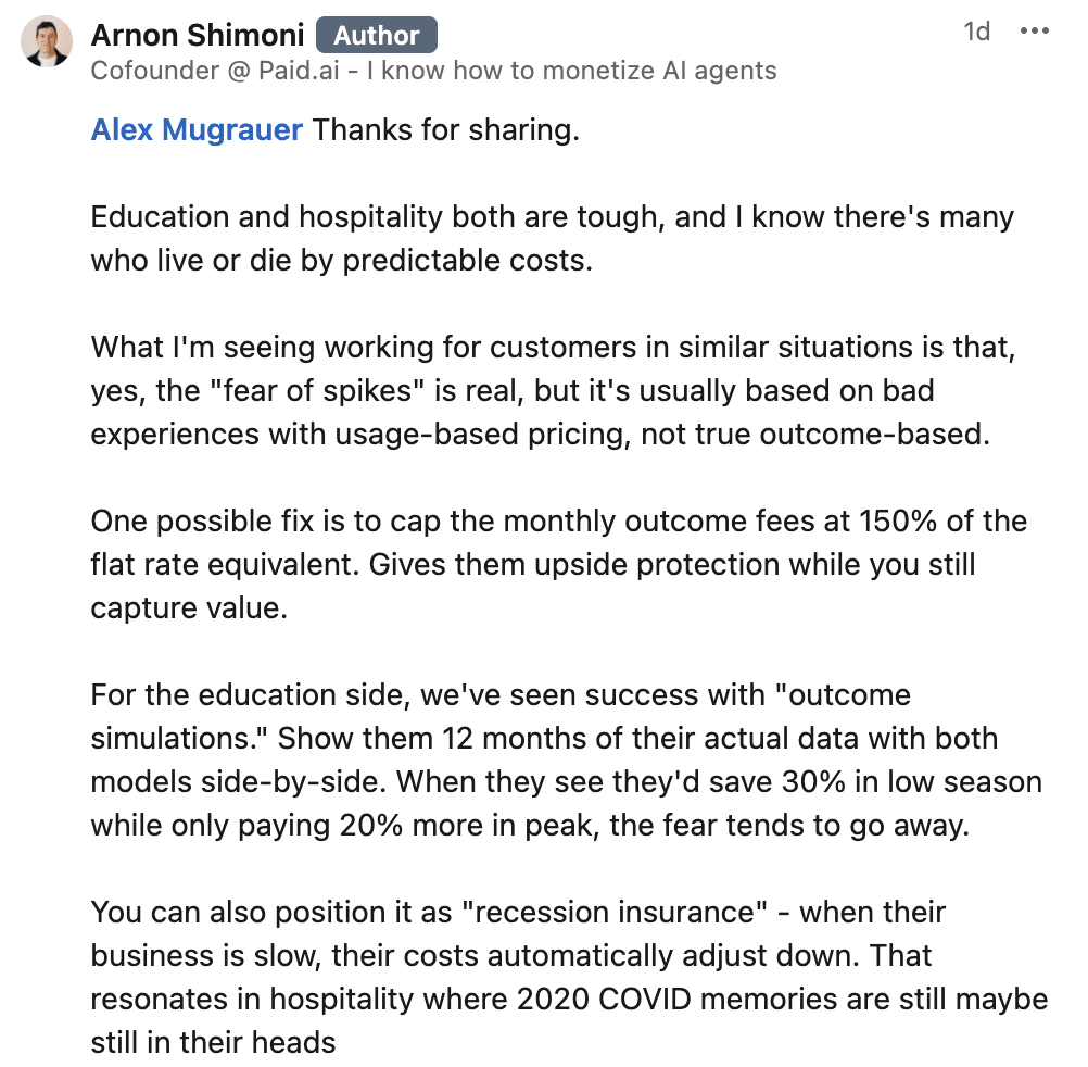 Set your outcome based pricing with a monthly cap (e.g. 150% of flat rate equivalent). This gives you upside while giving customers a ceiling they can plan against.