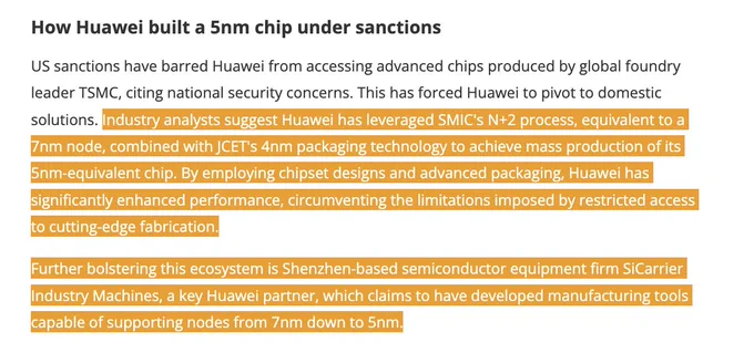 Must-read: Huawei’s 5 nm Kirin X90 uses SMIC’s N+2 process and JCET’s 4 nm packaging technology—industry analysts. US sanctions have barred Huawei from accessing advanced chips produced by global foundry leader TSMC, citing national security concerns. This has forced Huawei to pivot to domestic solutions. Industry analysts suggest Huawei has leveraged SMIC's N+2 process, equivalent to a 7nm node, combined with JCET's 4nm packaging technology to achieve mass production of its 5nm-equivalent chip. By employing chipset designs and advanced packaging, Huawei has significantly enhanced performance, circumventing the limitations imposed by restricted access to cutting-edge fabrication. Further bolstering this ecosystem is Shenzhen-based semiconductor equipment firm SiCarrier Industry Machines, a key Huawei partner, which claims to have developed manufacturing tools capable of supporting nodes from 7nm down to 5nm.