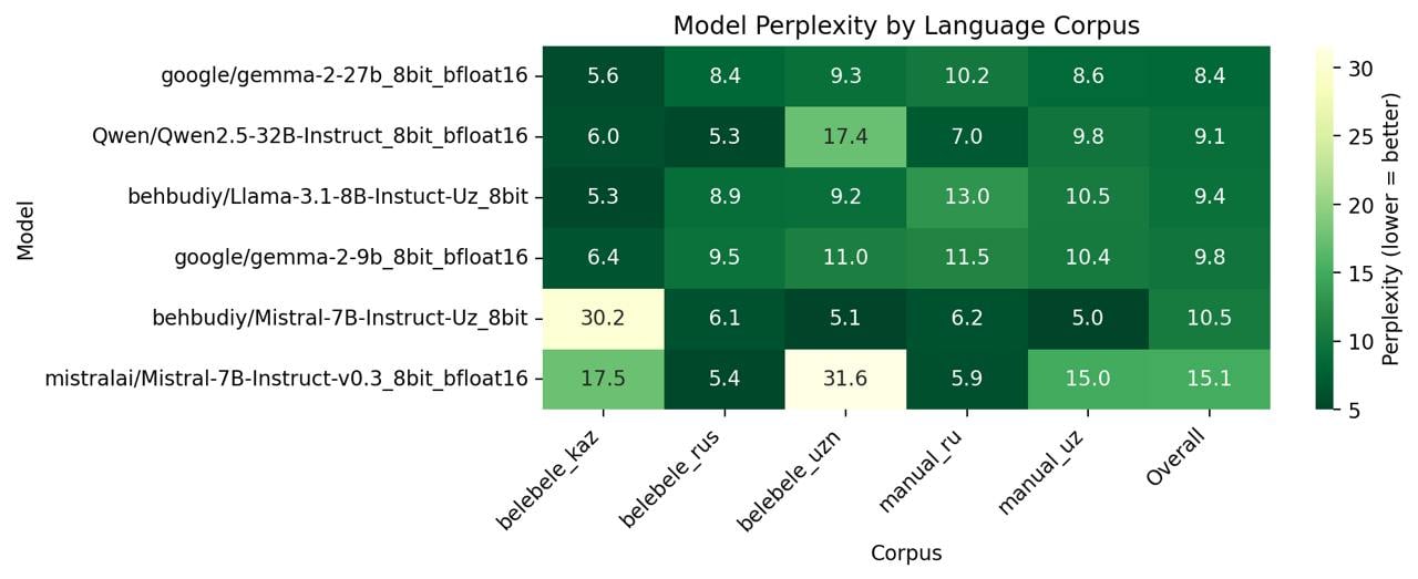 Benchmark data: 100 sampled passages each from Russian, Kazakh, and Uzbek Belebele splits.
