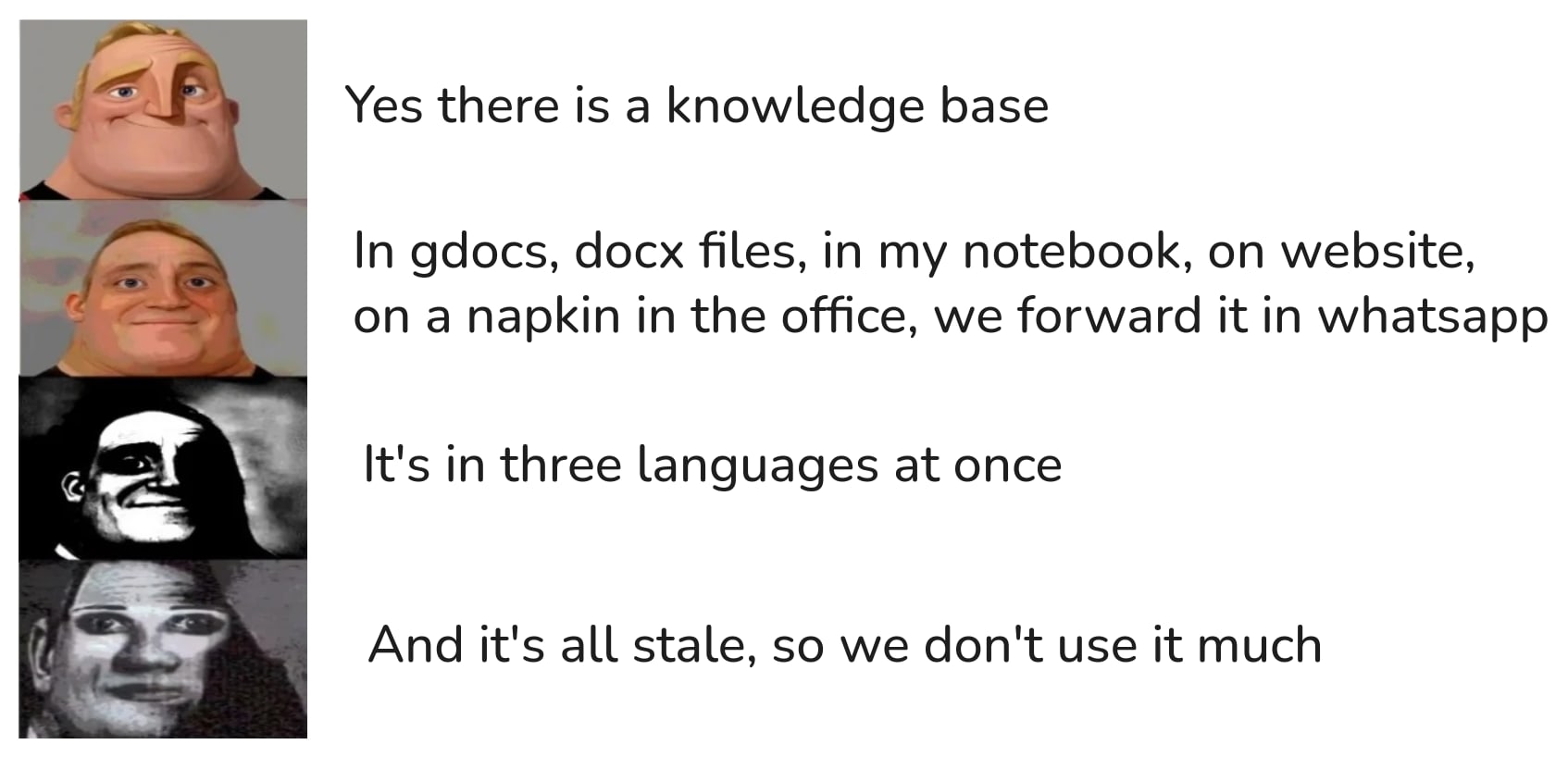 Knowledge base often scattered in surprising places: Slack threads, notes scribbled on napkins, post-it stickers on the office fridge.