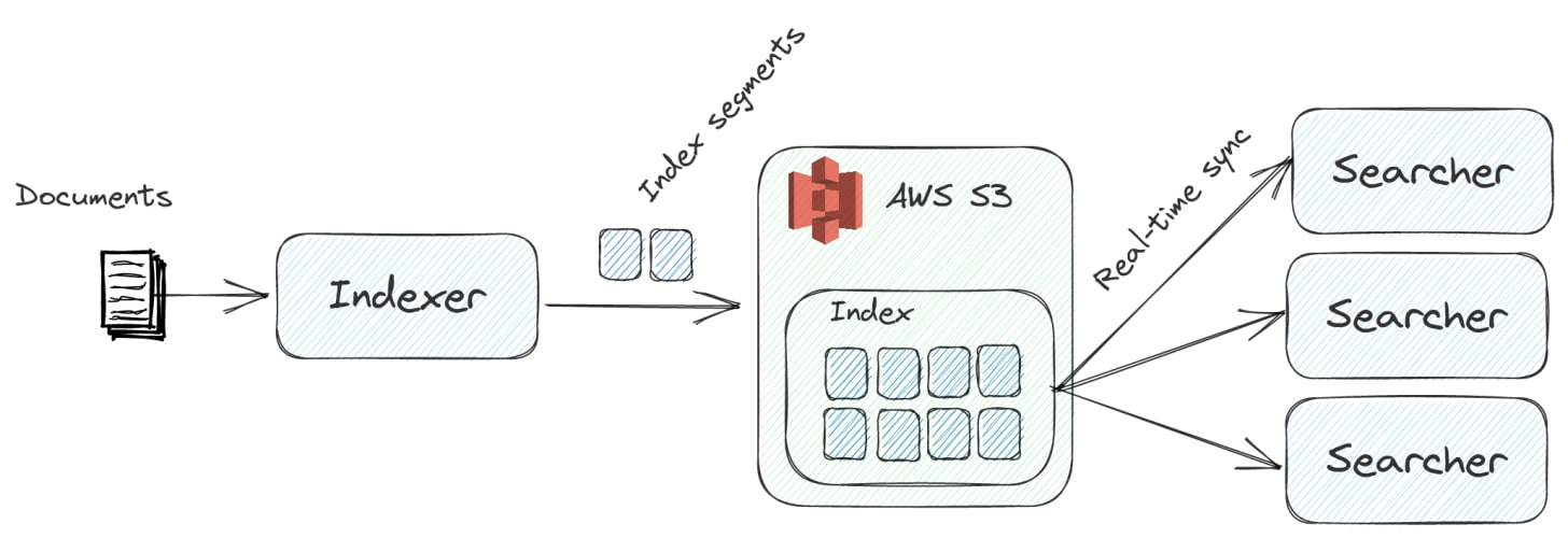 $> nixiesearch index file -c config.yml --url s3://bucket --index hello $> aws s3 ls s3://bucket/hello -rw-r--r-- 1 shutty shutty 512 May 22 12:55 _0.cfe -rw-r--r-- 1 shutty shutty 123547444 May 22 12:55 _0.cfs -rw-r--r-- 1 shutty shutty 322 May 22 12:55 _0.si -rw-r--r-- 1 shutty shutty 1610 May 22 12:55 index.json -rw-r--r-- 1 shutty shutty 160 May 22 12:55 segments_1 -rw-r--r-- 1 shutty shutty 0 May 22 12:48 write.lock $> nixiesearch search -c config.ymlThe searcher backend just picks up the latest index, and that’s it.