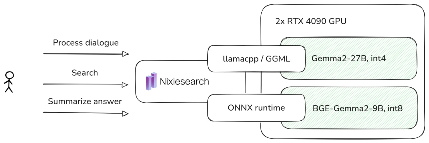 The whole system runs on-prem on a single 4U server with 2x RTX4090 GPU, but with free room for more.
