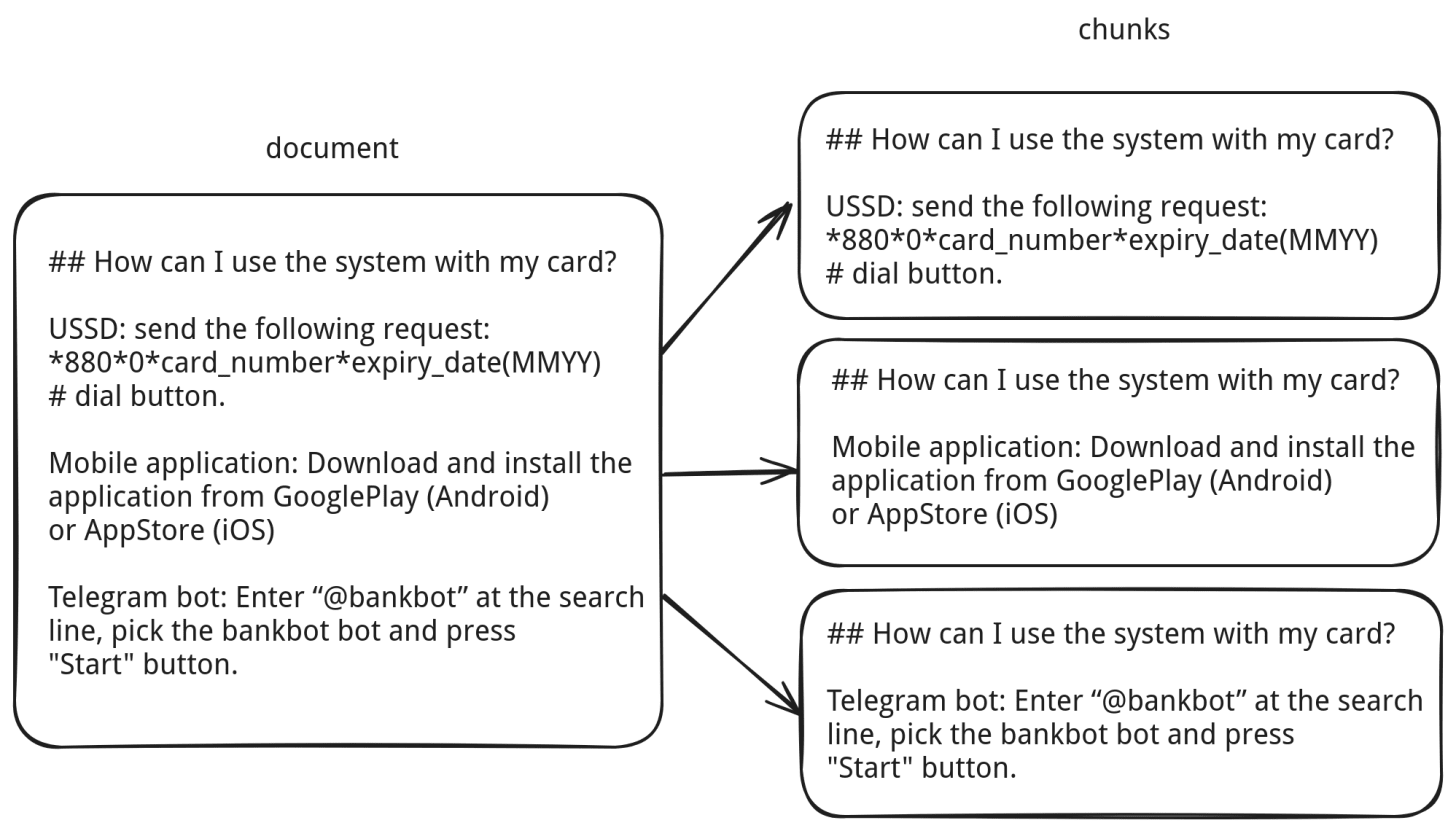 Given the relatively small dataset we had, we considered using large chunks, or even no chunking at all. In practice, that meant when you searched for a query, you might end up getting an entire document back as the search result: