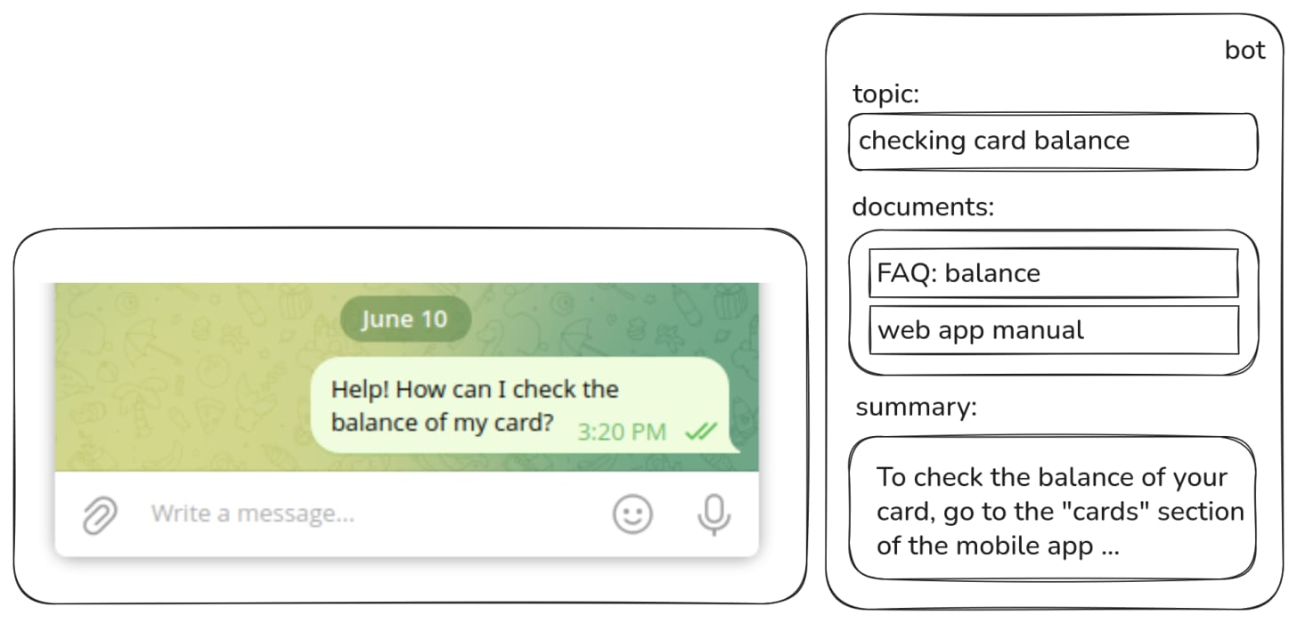 It’s basically a textbook RAG setup with one small twist: you first need to extract the actual request from the conversation. After that, it’s business as usual: