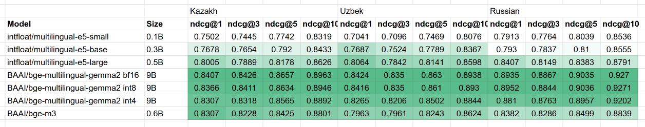 So, we took the English split of the MIRACL dataset, translated it into Kazakh and Uzbek, and ran the MTEB benchmark across all the open-source multilingual embedding models we could get our hands on.
