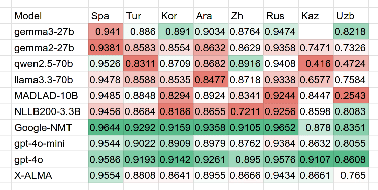 To test that, we ran a quick evaluation on the FLORES-plus dataset using the XCOMET metric across various language pairs (en→xx). The results? For low-resource languages like Kazakh and Uzbek, GPT-4o outperformed Google Translate both in translation quality and cost.
