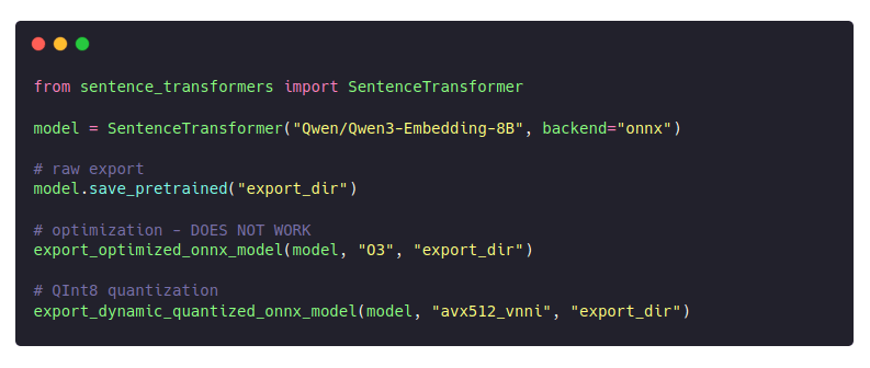 Gemma2 isn’t your typical encoder-based embedding model like everyone’s used to. Nixiesearch uses ONNX as the runtime for embedding inference, so we were a bit cautious going in. But to our surprise, the ONNX export worked flawlessly with the latest version of sentence-transformers.