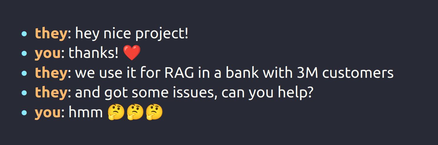 Nixiesearch is open-source, with no VC or corporate backing, so we fully embrace the no-gatekeeping approach. But that also means you occasionally get some surprising conversations in the community Slack after dropping a big feature, like local RAG support:
