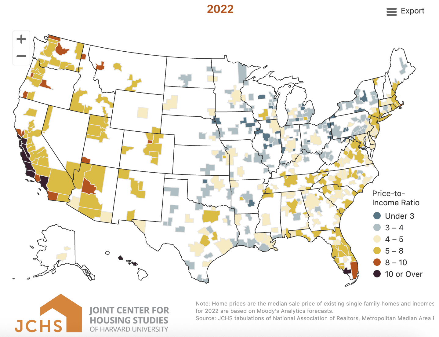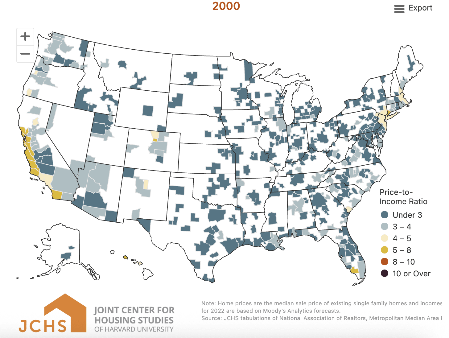 The color-coded maps of Harvard’s Joint Center for Housing Studies make the point starkly. In 2000, most markets had a price-to-income ratio under 3. That means the typical price for a single-family home cost less than 3 years’ income. By 2022, the price-to-income ratio across the country had doubled. For all the economic and scientific advances of the 21st century, the last quarter century has been the period when the typical American had to work twice as hard to buy a house where they lived.