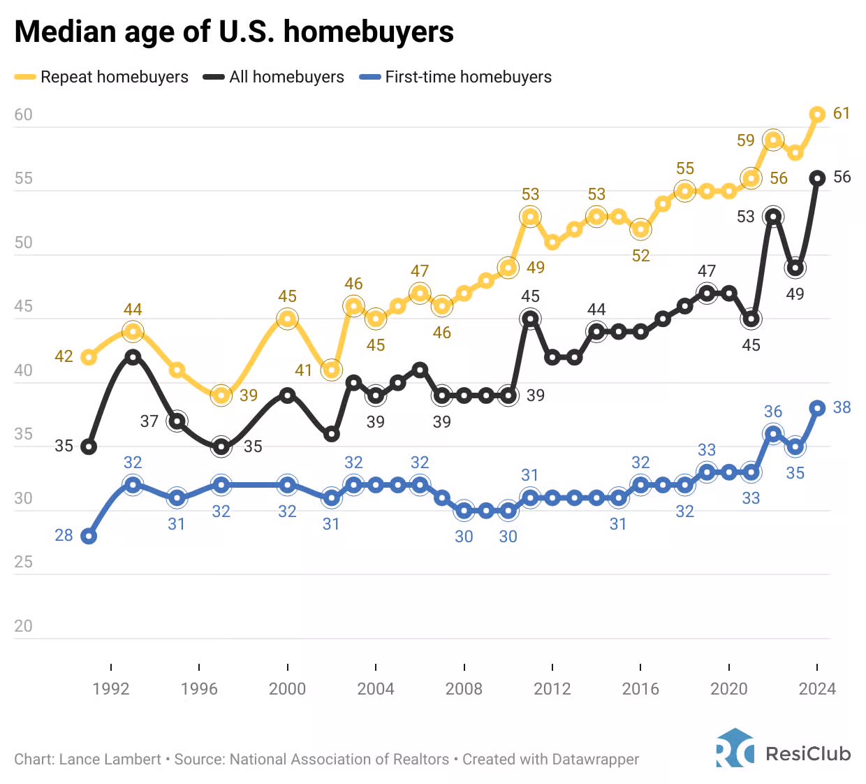 Indeed, until recently, it was common for couples in their mid-20s to buy their first house. Today it’s a rarity. In 1991, the median age of first-time homebuyers was 28. Now it’s 38, according to the National Association of Realtors. That’s an all-time high. In 1981, the median age of all homebuyers was 36. Today, it’s 56—another all-time high. This is the hardest time for young people (defined, generously, up to 40!) to buy their first home in modern history.