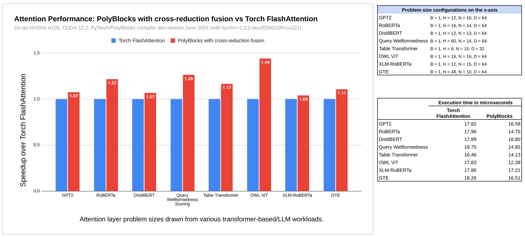 PolyBlocks from Polymage Labs is a 100% code-generating, fully automatic, and analytical model-driven compiler engine based on MLIR. It can be viewed as an MLIR-based pass pipeline with 200+ passes that transform and optimize IR through various stages. It mainly employs polyhedral abstractions and optimization techniques in the mid-level stages while optimizing computations on high-dimensional data spaces. The optimization techniques encompass tiling, fusion, performing recomputation (in conjunction with tiling and fusion), packing into on-chip buffers for improved locality, eliminating intermediate tensors or shrinking intermediate tensors to bounded buffers fitting into on-chip memory, mapping to matmul/tensor cores, and efficient parallelization in a way unified with all other transformations. Several MLIR upstream passes are also used in the PolyBlocks’ code generation pipeline. Unlike XLA, TensorRT, or Torch Inductor, PolyBlocks does not rely on any hand-written code, kernels, or libraries to pattern match to and substitute, i.e., no libraries like CUTLASS, CUDNN, CUBLAS, ROC-BLAS, flash attention, or any cu* kernels or their variants are used.