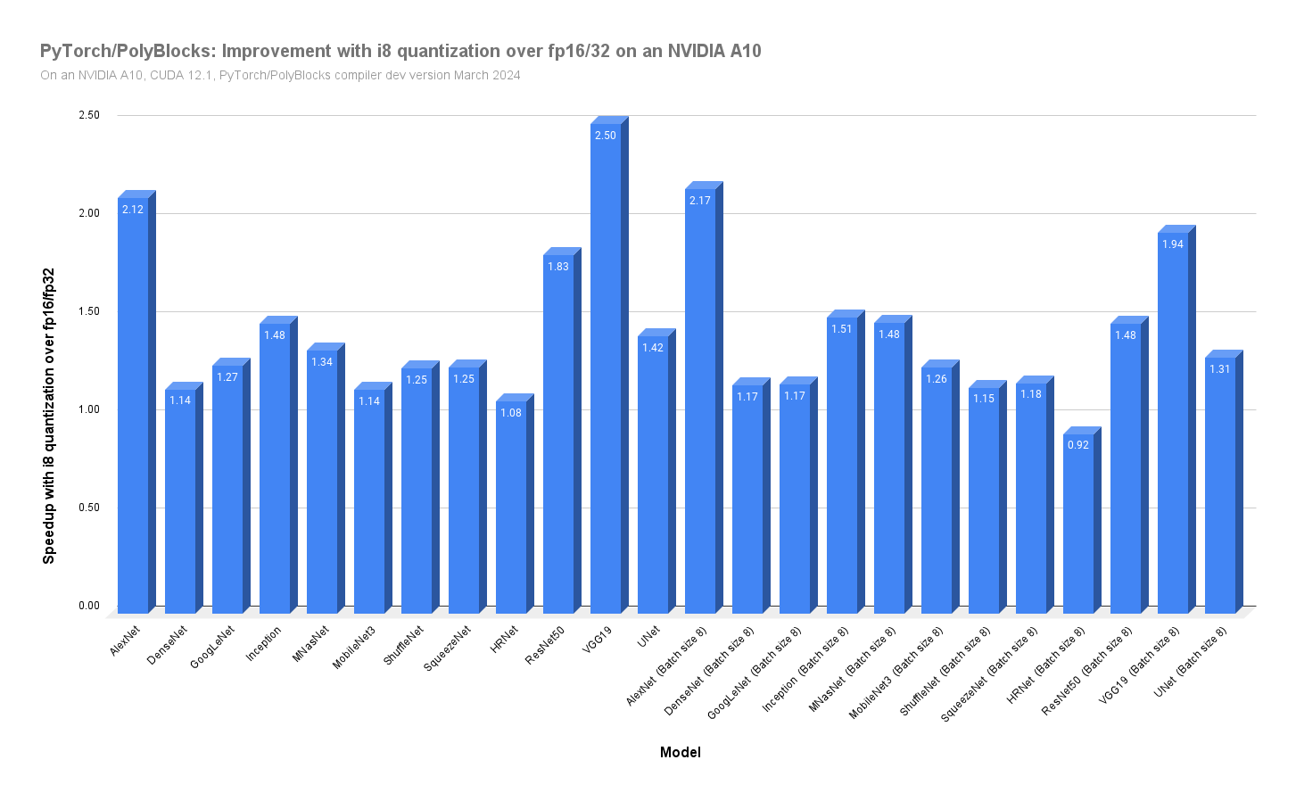 PolyBlocks supports PyTorch models quantized using Quantization 2.0 workflow. All optimization that works on non-quantized models, like fusion, vectorization, tensor-core mapping, etc., works out of the box for quantized models. This is an extremely productive workflow for using quantization with an MLIR-based compiler. An example is shown below.