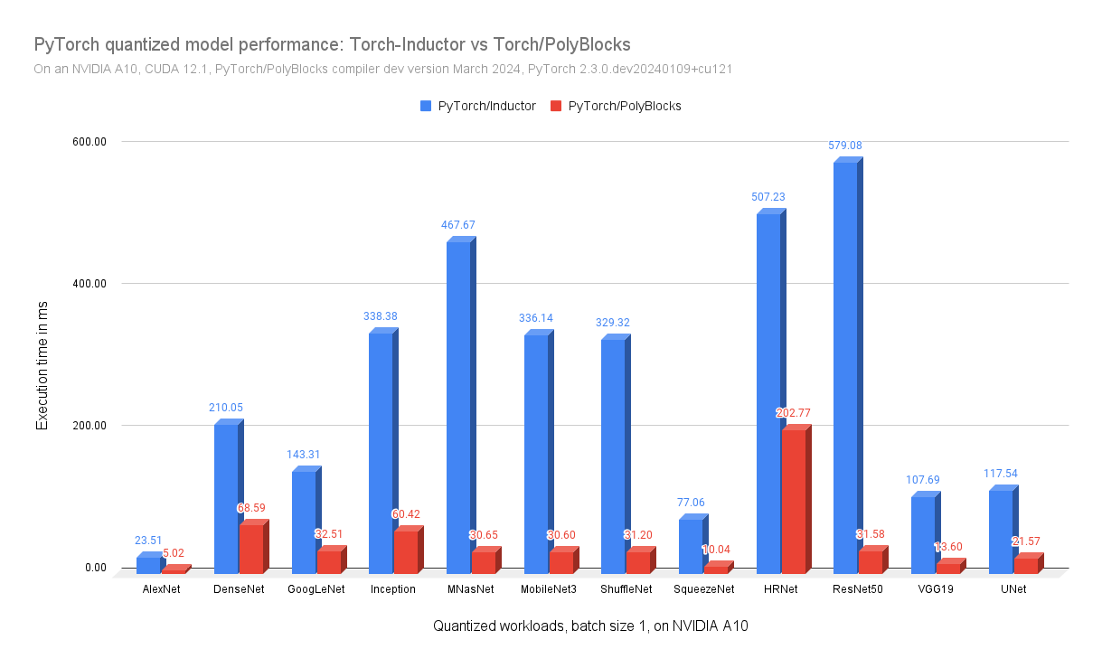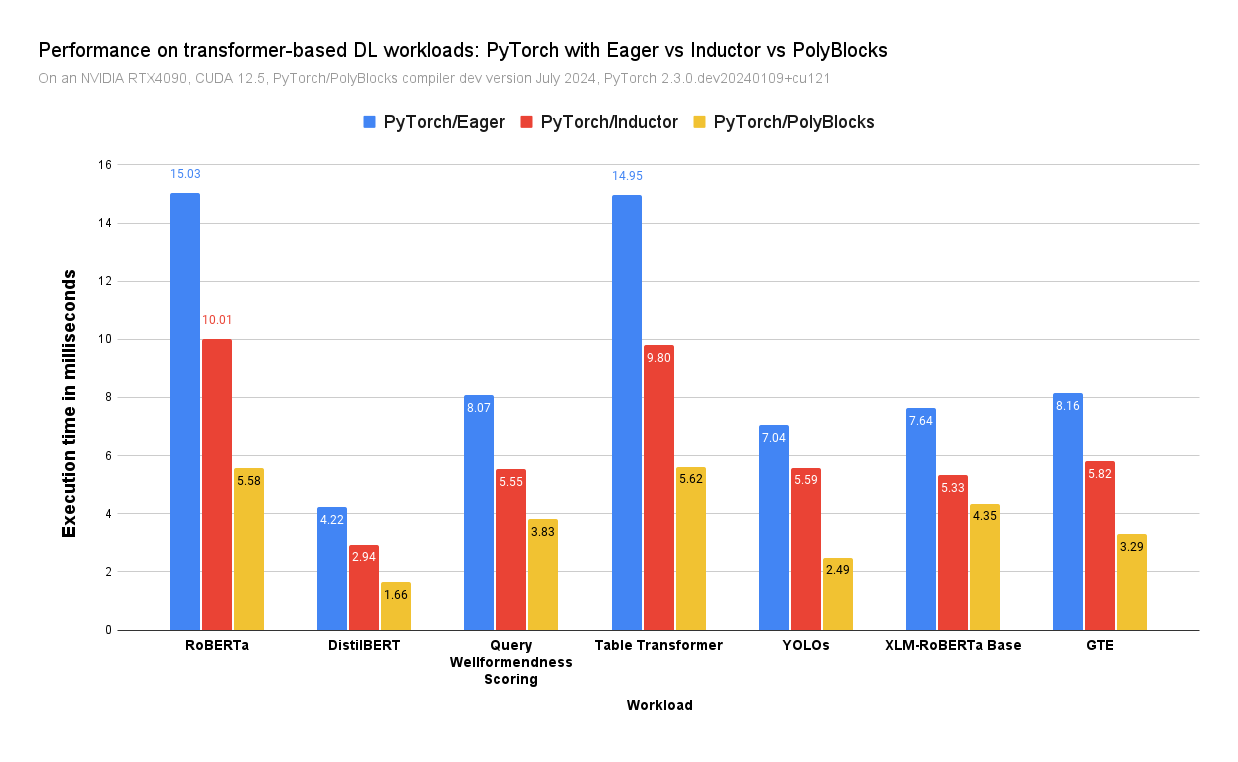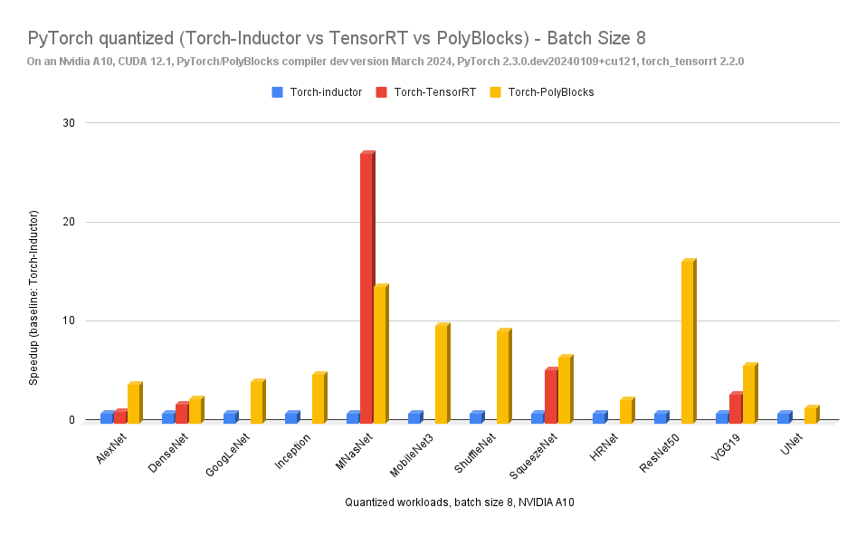 While PolyBlocks is still a work in progress with more optimizations to be implemented in the coming weeks, its performance has already reached a point where it is three times as fast as PyTorch standard (non-compiled) and even about 2x as fast as Torch Inductor (the current production-strength compiler for PyTorch) on some workloads.