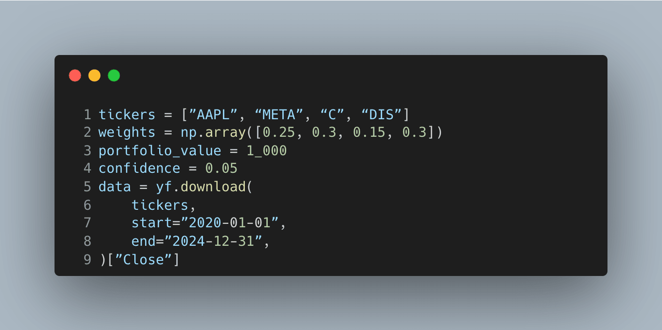 This step ties VaR to positions you could actually hold, which keeps the later loss number actionable in dollars. We use a 5% left-tail probability, which corresponds to a 95% one-day VaR under a one-sided view. For production, prefer adjusted prices (“Adj Close”) to handle splits/dividends cleanly and avoid distorted returns.