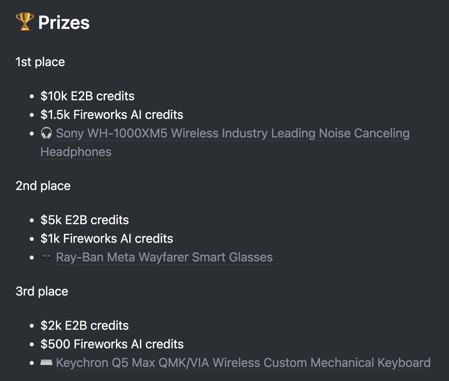 Prizes are tricky because people already have everything. I thought our prizes were nice, we provided product credits, and hardware tech gadgets like the best-rated noise-canceling headphones or mechanical keyboard. However, based on feedback the prizes could be better. How to think of something original?