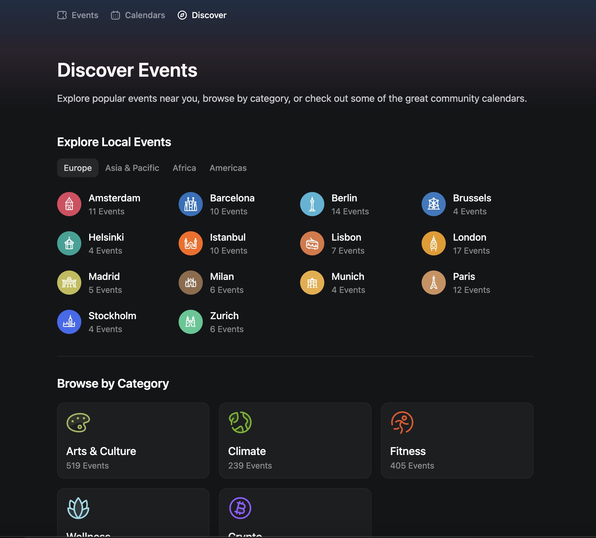 Find if your city or topic has its own Luma calendar: https://lu.ma/discover