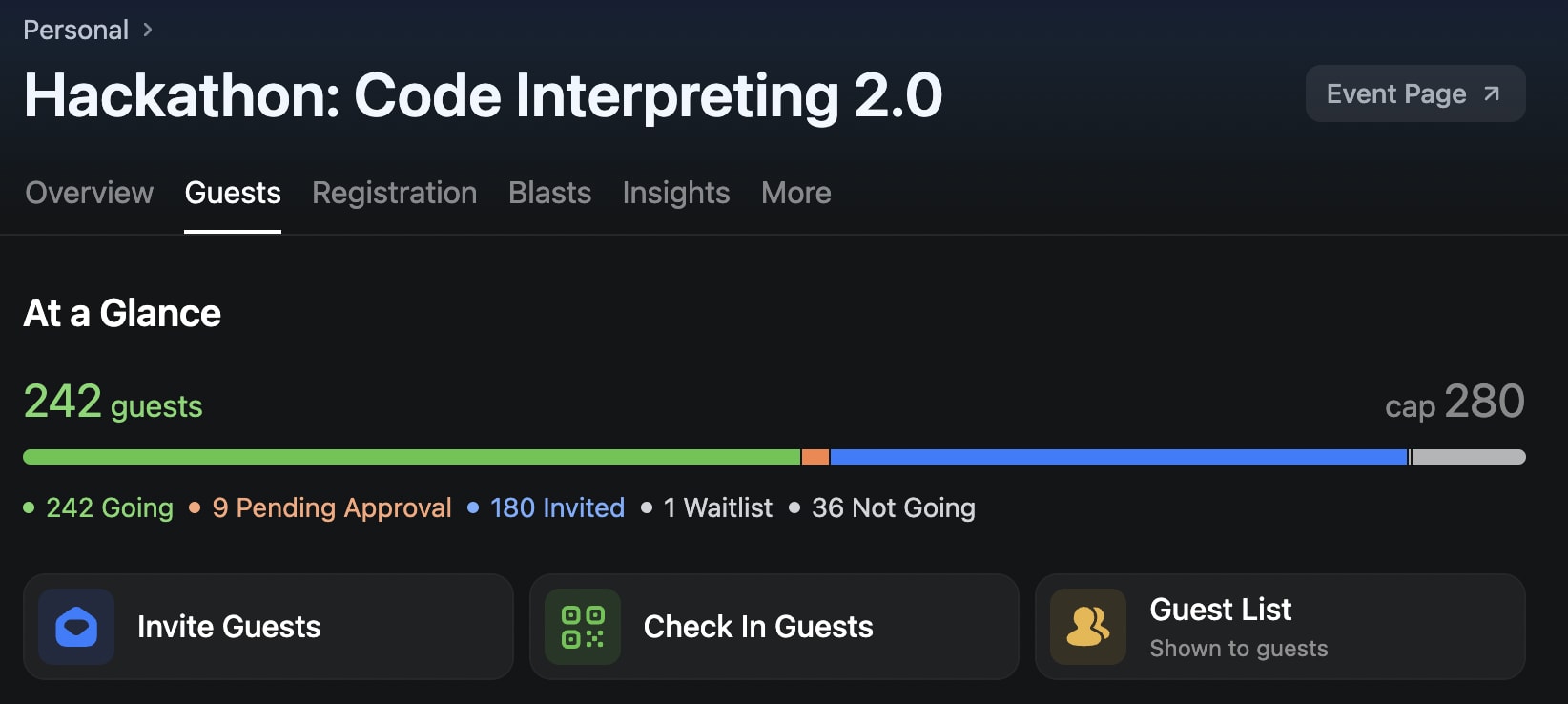 Invite people personally. Of course, you can’t scale this, but it’s good to think about a few people who are relevant for the event and you already have some relationship with them (or want to have). For example, I once saw a Twitter post about a San Francisco hackathon that just happened and was on a similar topic. I cold DMed the winners of that hackathon and told them about my hackathon. Surprisingly, some of them really came to my event. Similar way you can invite relevant people who interact with your content, are in hiring process, or you just know them outside of work.