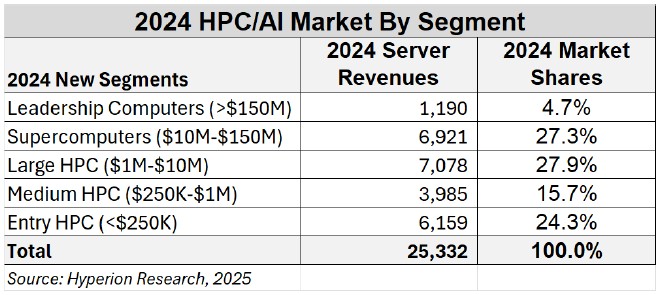 That said, and as evidenced by the nine new supercomputers announced by the US Department of Energy back in October, the investment in HPC-AI systems is accelerating. The details are a little scarce on these machines, but it looks like these will be more HPC-AI outposts of Oracle Cloud Infrastructure that the DOE labs rent rather than something they will buy outright as has been done for decades. Shifting to a cloud model will mean HPC-AI revenues will level off over the years, but it also means they will average out instead of being lumpy. All we know right now is that Hyperion says for the first half of 2025 the overall HPC-AI market grew by 22 percent, which is pretty close to the 23.5 percent growth rate seen in 2024.