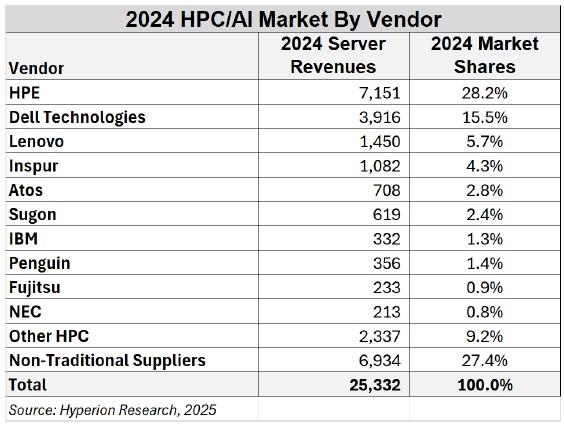 Dell is, as you might expect, number two in the HPC-AI space, and that might be surprising given that out there in the general purpose market, Dell is considerably larger than HPE when it comes to server revenue streams.
