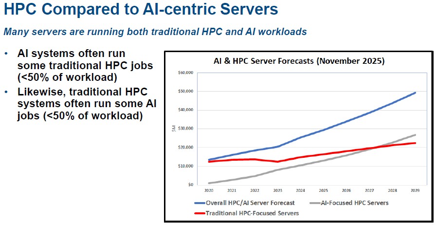 However, sometime around the middle of 2027, AI-centric iron (more than 50 percent of workloads are AI jobs) will account for more sales than HPC-centric iron (more than 50 percent of workloads are HPC jobs). Over time, as AI functions are infused in HPC applications, this differentiation will be harder and harder to qualify, much less to quantify.