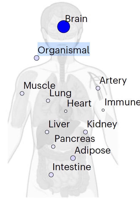The preprint of the study I’m reviewing here will be published in Nature Medicine on July 9th without material change. The pioneering organ clock work of Tony-Wyss Coray and his collaborators (see our podcast along with 2 prior Ground Truths noted at the top of this post) culminated in this report of ~3,000 plasma proteins in ~45,000 UK Biobank participants who were followed for about 17 years. The high-throughput protein assay provides biological age data for 11 organs, along with a body-wide age clock (organismal, not organ specific) and conventional (trained on all plasma proteins assessed). The organ age is compared with the individual’s chronological age. Higher organ age was associated with related adverse health outcomes such as heart age for atrial fibrillation and congestive heart failure, and brain age for Alzheimer’s disease. Lifestyle factors also followed suit, such as