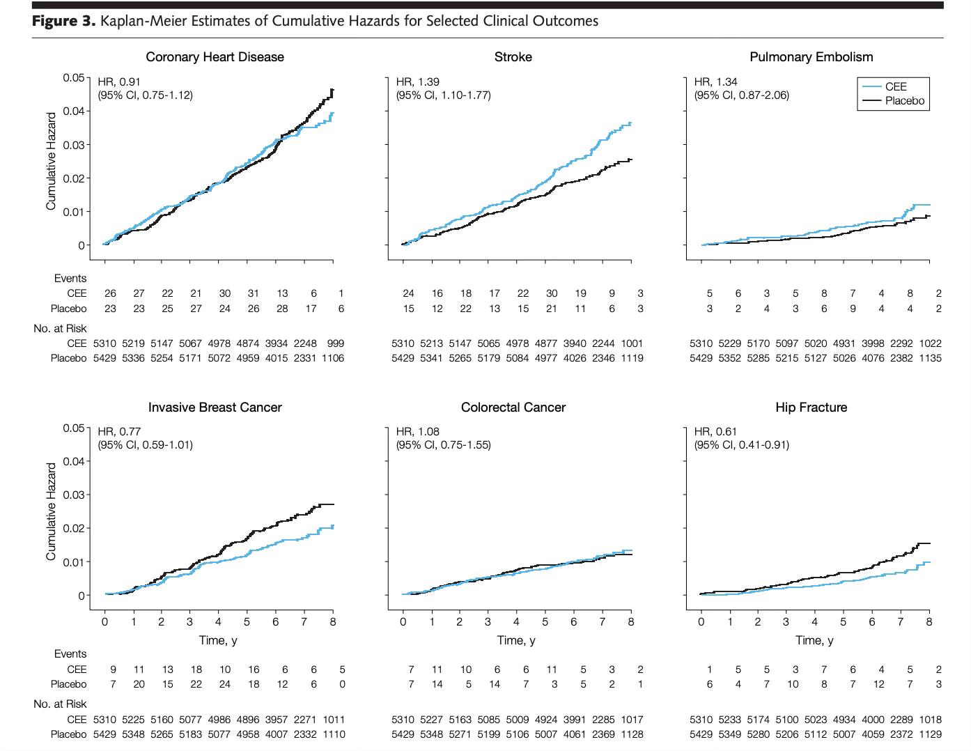Soon thereafter, in JAMA, the broader results of the WHI were published and summarized in the graphs below. There was evidence for an increased risk of coronary heart disease, stroke, pulmonary embolism, and invasive breast cancer, and reduced risk of colon cancer and hip fracture. While the increased risk was statistically significant, the absolute risk was small: “the absolute excess risk of events included in the global index was 19 per 10,000 person-years.” For invasive breast cancer, the relative 26% increase translated to an absolute increased risk of 8 cases per 10,000 women per year.