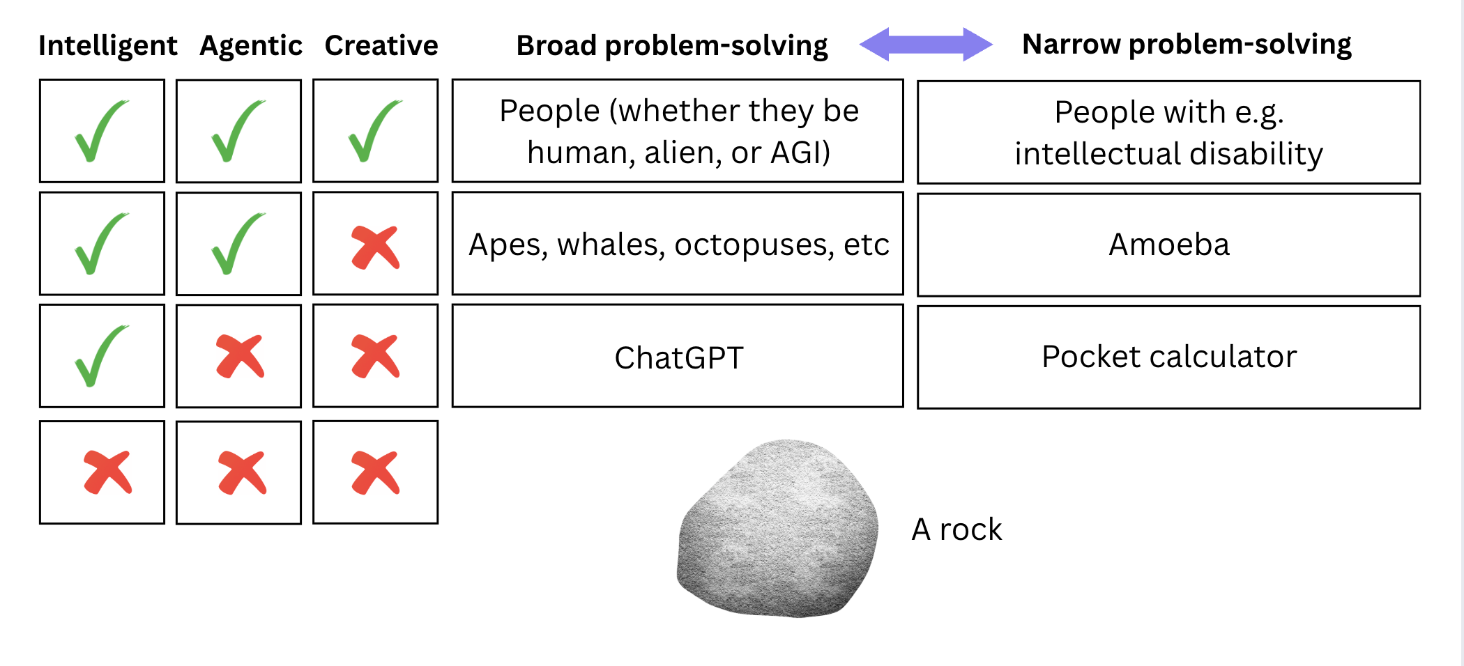 But we actually get a lot more clarity when we keep these two concepts separate. Intelligence does not require agency: your pocket calculator is capable of instantly solving problems that very few humans could tackle in their heads (or at all). And agency does not require much in the way of intelligence: an amoeba is an agent in the world, but it is only a tiny bit smarter than a rock.