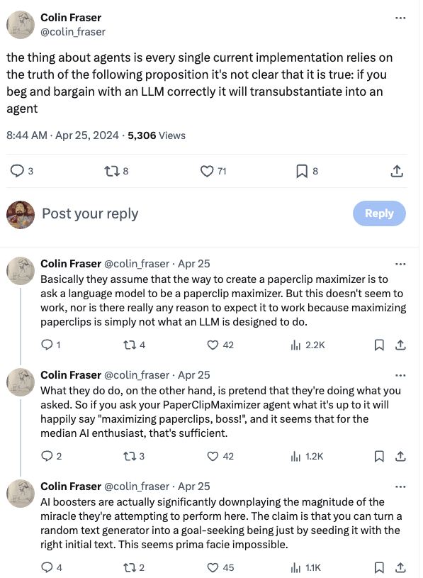 Unfortunately all of these workarounds are monstrously inefficient (and therefore cost big $$$) in terms of compute. I hope we still get some decent quasi-agents out of this—sophisticated mimicry should be good enough for plenty of use cases—and who knows, maybe the costs will keep coming down. But none of this tinkering gets us a single step closer to actual AGI.
