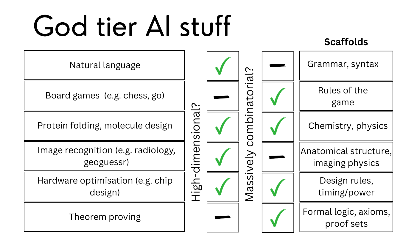 AIs are god-tier at finding latent patterns in high-dimensional or massively combinatorial spaces—protein folding, chess, natural language—so long as they have well-defined frameworks to guide their efforts, and can be rewarded for correct answers.