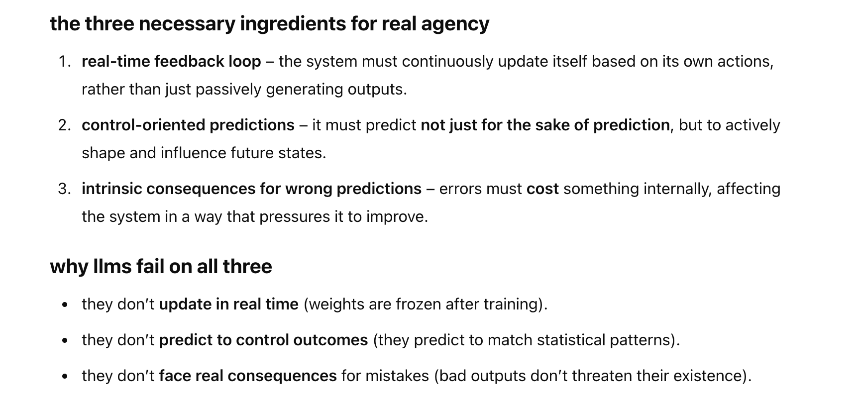 ‘Predict the next token’ and ‘predict reality’ in many cases return the same result, but wherever they come apart—where the training data is wrong, or incomplete—it’s impossible for an LLM to follow. There might be ways to patch this, but if models can’t learn in realtime, their usefulness as agents will always be constrained.