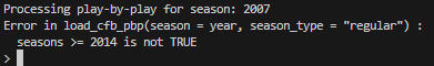 With this new bright idea, I went into my repo on Monday and was greeted with an interesting error when trying to scrape play-by-play data from the usually trusty cfbfastR package: