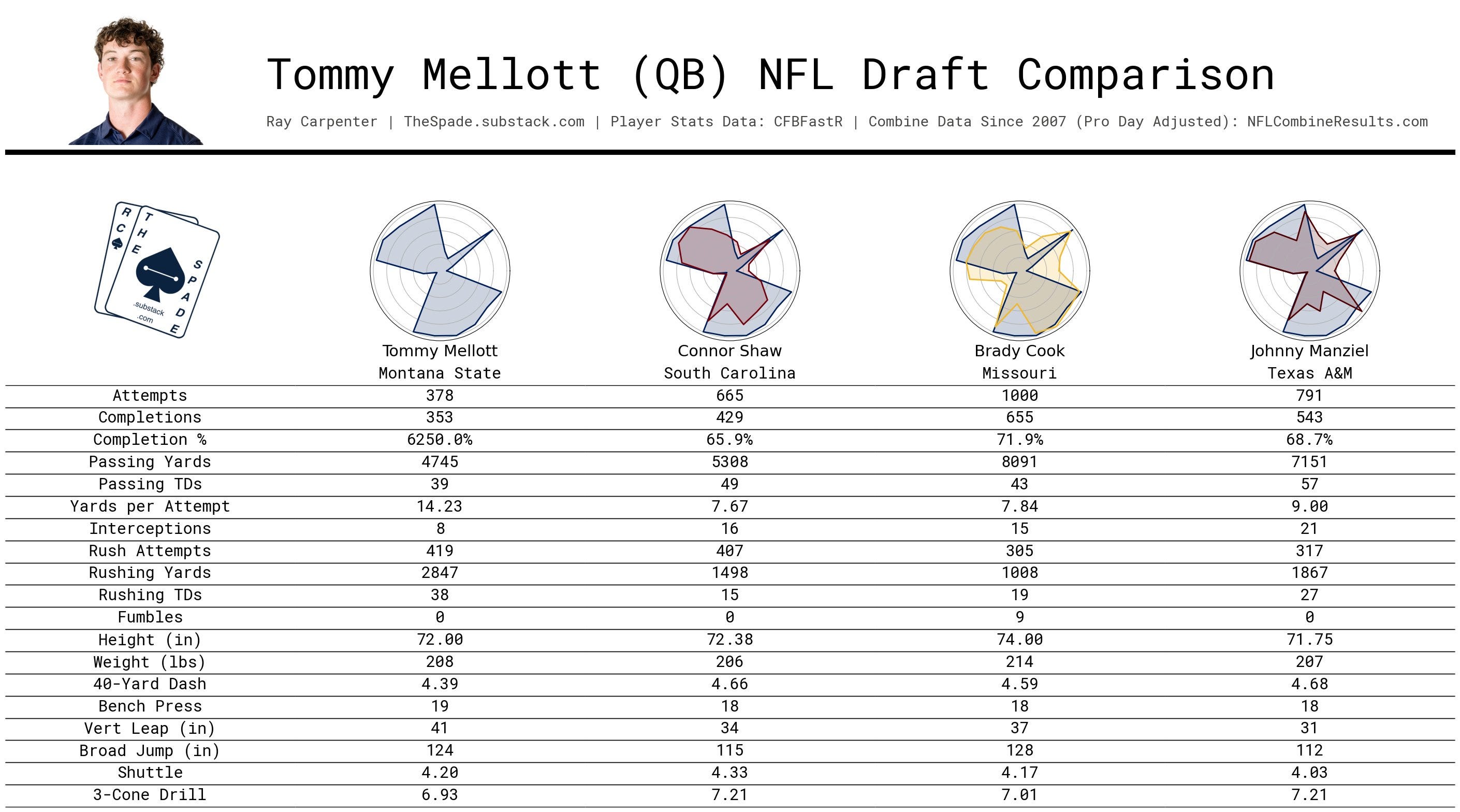 about Raiders WR/former Montana State QB Tommy Mellott, check it out here. Mellott was one of the most interesting prospects I saw for the 2025 NFL Draft. Here’s his comparison scorecard I posted back in April:I’ve enjoyed