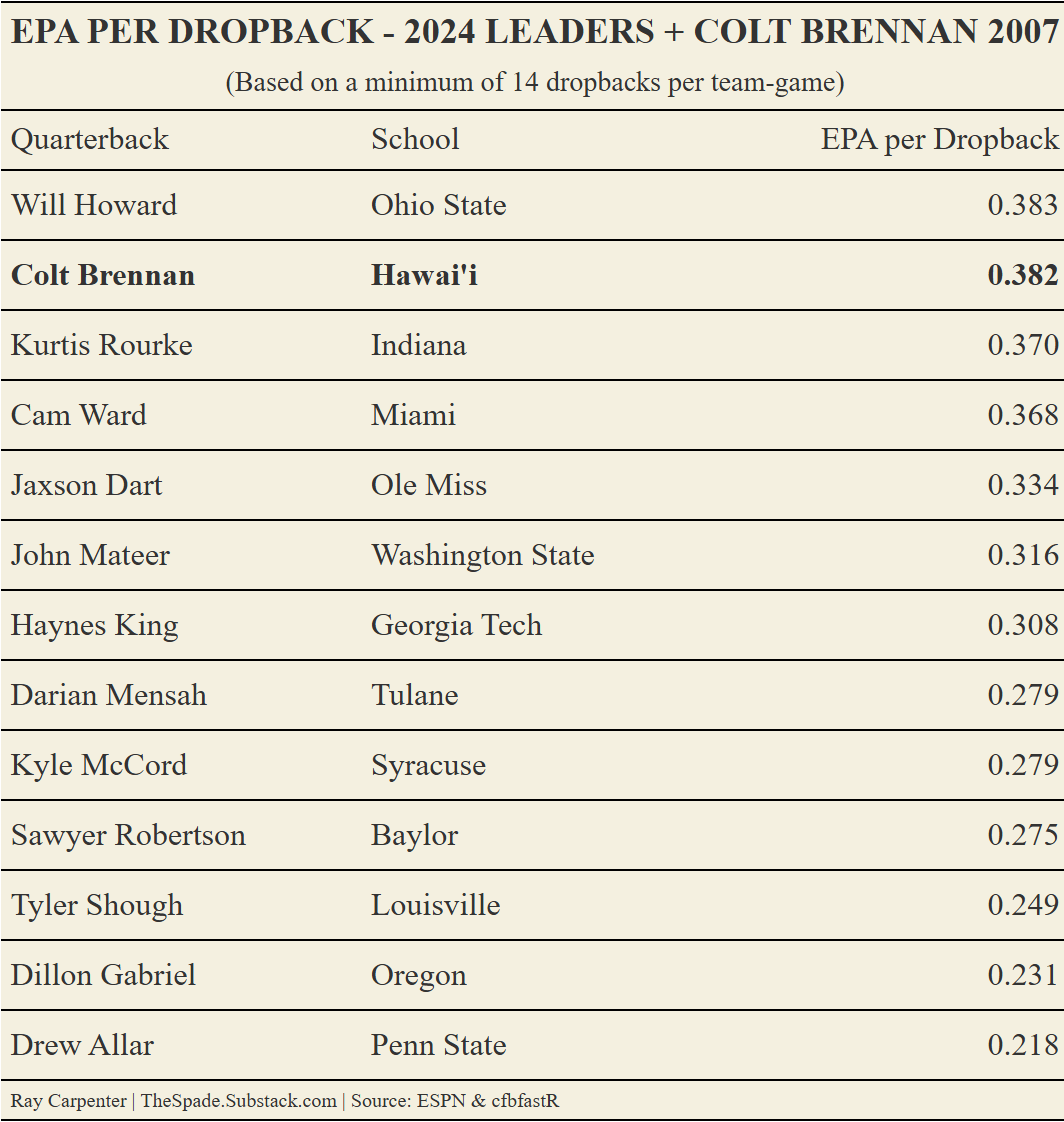 Excluding their bowl game, I grabbed every Rainbow Warriors game and calculated Brennan’s EPA per dropback. And here’s how he compared to the 2024 top 10 ranked players in the same category: