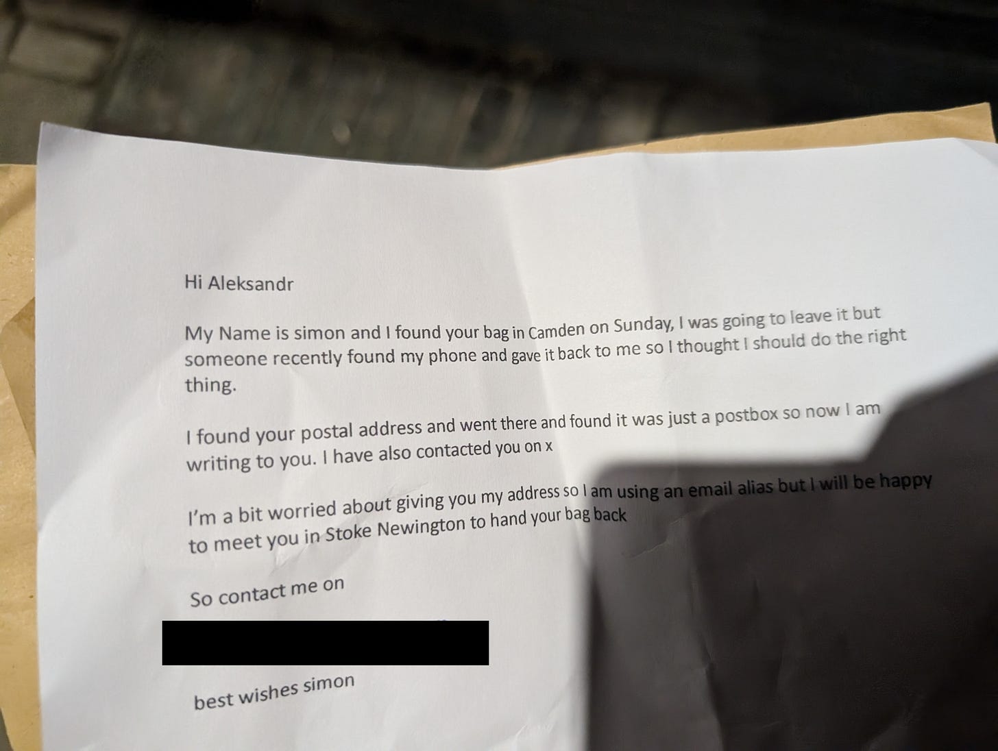 The very next day — two days after the loss — I received a letter to my mailbox address in London. A man named Simon wrote: he had found my backpack and wanted to return it. He’d spotted the bag in Camden and at first thought of walking past, but someone had recently returned his lost phone, so he decided to do the right thing. Social fabric in a high-trust society is structured in an interesting way: there is this sort of a domino effect — someone returned his phone, and he didn't leave my bag. Here's his letter in full!