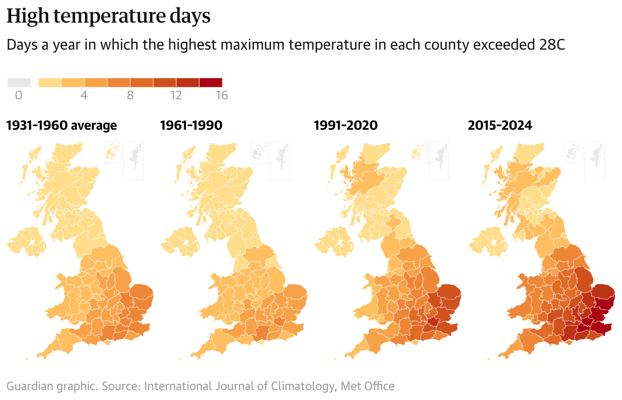 Certainly, 26C (about 79F) isn’t so hot, but the number of days above that threshold is increasing. And remember, this is a country that sends pensioners money every winter to help them pay for extra heating costs. Plans to lower the income cap for this benefit had to be mostly reversed after considerable backlash last year, so the Brits clearly recognize the danger of some temperature-related deaths.