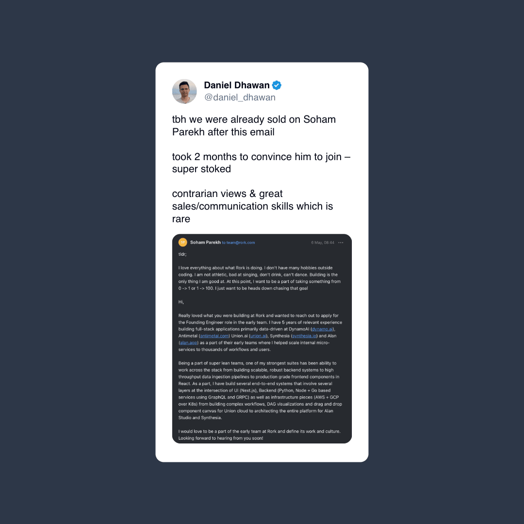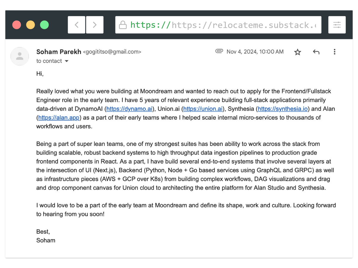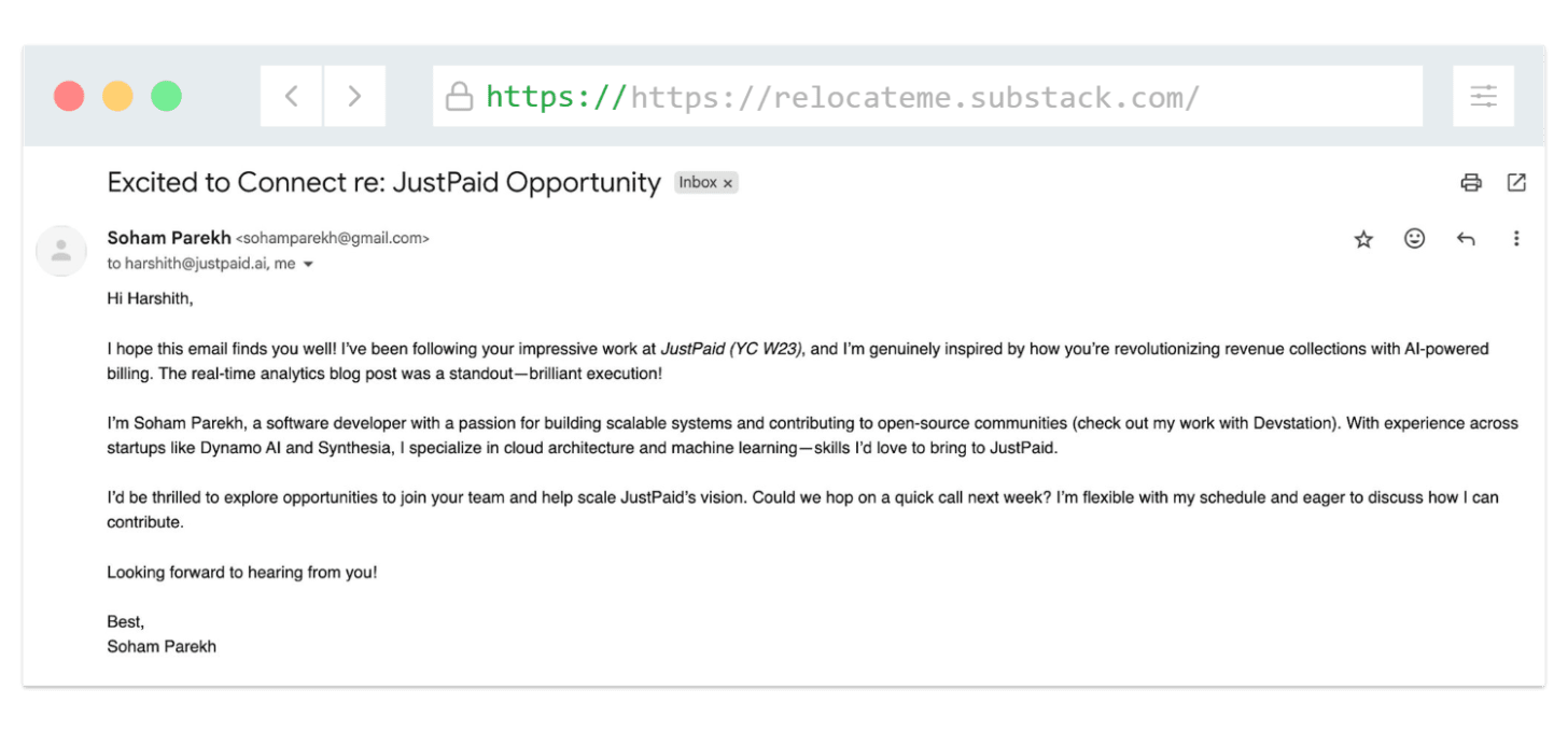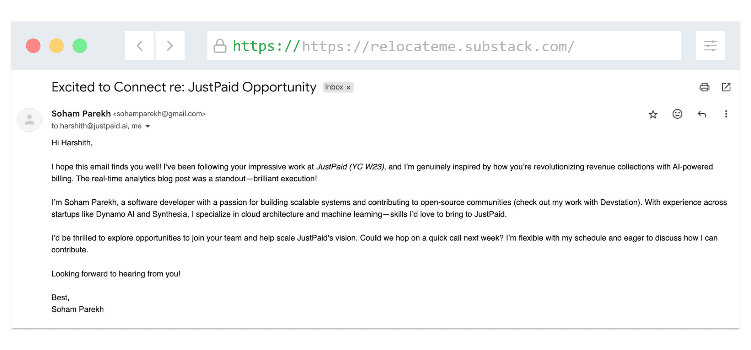 Remember that attention spans are very precious, and you have seconds to stand out. Don’t waste your silver bullet with an “I’m not just a developer; I’m a ninja” AI-slop phrase. Since Soham didn't do it, you shouldn't either. (There’s even a spelling mistake in some of his emails.)